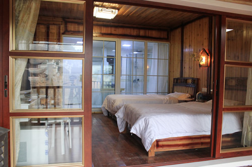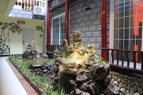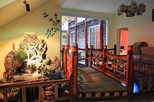古樸的客房內(nèi),超大陽臺全景落地窗,是您欣賞沱江風(fēng)光帶首選客棧,兩座百年四合院內(nèi)小橋流水,假山錦鯉,一百三十平米休閑花園別具情調(diào)。紅酒加咖啡的大堂吧、彩色精致的情調(diào)房、古典高雅的臨江觀景房以及大型公共觀景平臺,龍閣的點點滴滴都透著出古城的神韻和幽靜,走進龍閣客棧,給您一個完美的鳳凰古城沱江全景!