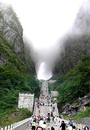 這里的山路99道彎 在懸空了二十四分鐘經(jīng)歷了奇險的8座山峰后,我們的心終于才踏踏實實的落到了地面上,到達了山頂。 山下晴朗山上雨。 乘坐在環(huán)保汽車上,透過車窗所能見到的似黛似玉的畫屏與絕壁千仞的壯觀;所能感受到的是蕩氣回腸的奇絕與如詩如畫的震撼。窗外仍然細雨蒙蒙,環(huán)保汽車繼續(xù)回旋在通天大道的彎道上,突然前面看不到公路的延伸,但車還在原速行駛,讓人多少有點害怕,誰知,在一個180度急轉(zhuǎn)彎后,環(huán)保車依然行駛在懸于半空的通天大道上,安然無恙。這大致就是通天大道的“絕”了,明明無路可走,誰知卻從一個讓你無法想象的角度把你的視線續(xù)接起來。回望一下,真是蠻有意境,象一條巨龍,攀附在山體,蜿蜒而上。 在我還在驚奇“通天大道”蜿延峻巡于群山絕壁之上的絕險感嘆 “通天大道”艱苦建筑于壁立萬傾之中的奇?zhèn)r,思路便被同伴雀躍的歡呼拉回!翱吹教扉T洞了!”。 999級的上天梯,有清代俞良模的提詞:莫謂山高空仰止此中真有上天梯。看來想要成仙還真得經(jīng)歷一翻磨難的。做了幾個深呼吸,開始爬上天梯,天門洞已經(jīng)呈現(xiàn):南北對開,大約150米左右高、氣勢磅礴,巍峨高絕,有團團云霧自洞中吐納翻涌,瑰麗神奇,宛如幻境。大約2平方公里的山頂,視野廣闊,往下看去,山在云中動,云附山體游,飄飄然的,還真有點仙人的感覺。洞口的風很大,這雨形成一大塊的雨屏,跟隨洞口來風改變著方向,肆意刮著,落在臉上很舒服…… 天門山是一幅濃墨淡彩的山水水墨畫,需要你慢慢品味…… |