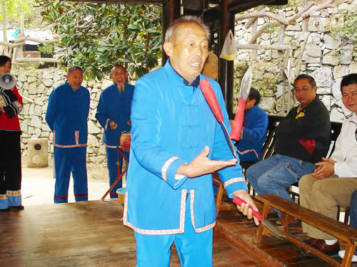 三棒鼓,是以拋三根棒和敲鑼打鼓得名,是土家山寨到處可見的一項以打擊樂器、口頭文學(xué)、表演技藝合為一體的文體活動形式。 打三棒鼓通常由三至五人組成,師傅擊鼓唱詞,一人打鑼,一人;ò簟⒒ǖ。由一人表演,將鼓架擺在前面鼓架上,將鑼掛在鼓架下面,用細繩系著鑼棒套在腳板上,表演時,口唱詞、手打鼓、腳踩鑼,鑼鼓節(jié)拍是按拋花棒、花刀速度的需要而定。三棒鼓的唱詞是五言四句重復(fù)半句組成。即五字一句,四句為一節(jié)。每小節(jié)的第四句要重復(fù)半句。每一小節(jié)擊響鑼鼓四遍。前三句是每唱完擊三響,最后一句唱完即每小節(jié)結(jié)束時擊響十下。例如唱:"學(xué)打三棒鼓",打"鏘鏘鏘";唱"學(xué)又學(xué)得苦",打"鏘鏘鏘";唱"三歲學(xué)到一十五",打"鏘鏘鏘";唱"學(xué)起呀,學(xué)起走江湖",打"鏘鏘鏘、鏘、鏘、鏘鏘鏘鏘鏘-鏘"。這一小節(jié),每唱一字為一拍,"鏘"為鑼鼓同鳴聲,每聲占一拍,標(biāo)點符號也占一拍。每拍的快慢取決于花棒下落的速度,任何一個花棒下落一次均為一拍。因此,如果花棒拋得低,下落的頻率就快,每拍所占時間就短,反之,花棒拋得高,每拍占的時間就長。三棒鼓的第二句和第四句都要求壓韻,一句和三句可壓可不壓. 打三棒鼓的技巧性很強,思想要高度集中,拋刀拋棒用力要適度,動作要敏捷準(zhǔn)確,稍有疏忽大意,不但表演失敗,還會被刀劃破手腳或誤傷他人。因此,凡是學(xué)打三棒鼓者,均需經(jīng)常練習(xí)飛拋接技術(shù),做到閉目均能拋接刀棒。因此,土家族青少年經(jīng)常用三個卵石練習(xí)拋接技術(shù),久而久之,熟能生巧,不但會拋棒,而且能拋刀。 打三棒鼓的鑼鼓曲牌不變,但唱詞多種多樣,除了固定的《十二月花》等唱詞外,均為即興編詞隨口而唱,唱三棒鼓歌的人,都是腦筋靈活、口才伶俐者。 |