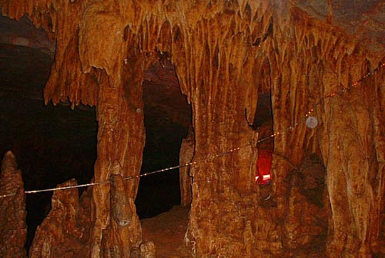 | 藏君洞為一大型天然溶洞,溶洞長25000米,已探明洞長4000m,洞內洞中有洞、洞中有河,迂回曲折,地下河流水潺潺,溶洞分布在石炭系中、上統(tǒng)碳酸鹽巖中,洞內鐘乳石十分豐富:石筍、石柱、石幔、石樓、石像比比皆是。洞內構造奇特,石鐘乳千姿百態(tài)、絢麗多彩,景觀奇秀,珍品奇絕,是我國少有的大型碳酸鹽巖巖溶洞穴之一。目前已開發(fā)的4000m洞穴中,由十二個大的溶洞群構成,由洞口往里有護君堂、惠帝殿、兩重天、南巡廳、不夜城、龍鳳宮、北國廳、江南廳、江河壩、閱兵場、國寶廳等溶洞景觀區(qū)。溶洞一般高5~30m,長60~100m,寬10~20m,面積60~200㎡。十二個溶洞沿地下河呈串球狀分布,洞與洞之間有巷道(地下河管道)相連,溶洞中景觀十分豐富,仿佛是一個瑰麗的地下宮殿。如護君堂內有“尚書帽”、“御馬”、“貓頭鷹”、“小羊羔”、“老夫妻”、“天宮浴盆”等景點,惠帝殿內由“斷劍石”、“龍椅”、“觀音立佛”、“觀音蓮花寶座”等,“蔬果長廊”中有形似花菜、白菜、絲瓜、茄子、黃瓜等石筍,不夜城內有乳白色石鐘乳巖溶坡面,龍鳳宮內有石幔、石柱琳瑯滿目及鐘乳石構成的似漢白玉“龍鳳石床”、“旭日東升”的浮雕石鐘乳墻、“燈籠群”、“攀龍柱”、“石蓮花”等,國寶廳巨型石柱等,巷道側壁唐僧師徒“西天取經(jīng)”壁畫等,景觀類型齊全,是巖溶洞穴中具有典型地學意義的巖溶地貌景觀,屬國家級的地質遺跡景觀。