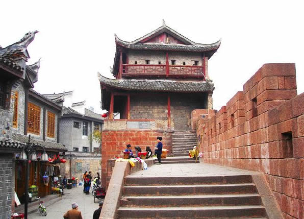 到清朝,古城的軍事地位日顯重要,先后在這里設(shè)鳳凰廳、鎮(zhèn)竿鎮(zhèn)辰沅永靖兵備道治所,古城的建設(shè)也得到加強。康熙五十四年(1715年)遂將磚城改建為石城,北門定名為“壁輝門”,一直保存至今。北門古城樓采用本地紅砂條石筑砌,做工考究,精鉆細(xì)琢。城門呈一半月拱,有兩扇鐵皮包裹。圓頭大鐵釘密鉚其上的大門。城樓用青磚砌筑,重檐歇山頂,穿斗式木結(jié)構(gòu),石座卷頂。城樓對外一面開槍眼兩層,每層4個,能控制防御城門外一百八十度平面的范圍。北門城樓與東門城樓之間城墻相連,前臨清澈的沱江,既有軍事防御作用,又有城市防洪功能,形成古城一道堅固的屏障,雖幾經(jīng)戰(zhàn)火,仍巍峨聳立于沱江河岸。