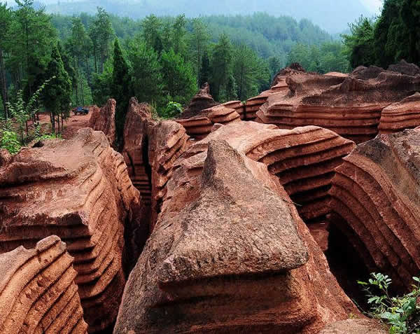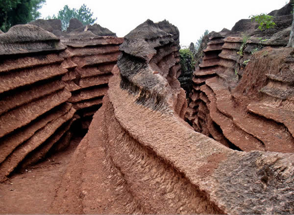 紅石林 告別船工后一切便突然安靜下來,過山谷的小路沒有人家,偶爾傳來幾聲清脆的鳥叫。穿過幾座隘口,峰回路轉(zhuǎn)后“石林”漸漸露臉,石頭的顏色是由灰白到棕紅,變幻而又使人聯(lián)想。間或一棵參天大樹,或是綠竹三兩棵,則又是另一番景致了。于高于低、于肥于瘦的石林,于石于樹、于濃于淡的色彩,顯得雄奇又雋秀,并透露出一種清靈飄逸。 這些石柱不但顏色各異,而且大小不等。有的高達(dá)七、八米,而有些則像半埋于地下的巨獸骨架。一位村民告訴記者,現(xiàn)在石林沒有以前壯觀,都長渣子(灌木)了。原因是由于山頂樹木減少,雨水將泥土帶下山,很多石頭都被埋在土下,后來這些地方都開墾了農(nóng)田,石林也被永久覆蓋。 由于泥土覆蓋,石林被切割成一個(gè)個(gè)小區(qū)域,有些隱蔽在果林中,而有些則像突然從天而降,散落田間。