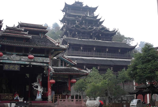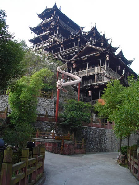 九重天 九重天世襲堂是土家風(fēng)情園的精華和靈魂所在。該建筑由土家民間藝人李宏進(jìn)設(shè)計(jì),依80度陡坡而建,高48米,共9重12層,整個(gè)樓房全部用木栓連接,沒有一顆鐵釘,堪稱土家族建筑史上的奇跡。2002年9 月22日,九重天吊腳樓被載入世界吉尼斯世界紀(jì)錄,認(rèn)定其為目前中國最大、最高、最完美的木質(zhì)結(jié)構(gòu)吊腳樓。2001年4月6日,朱镕基總理視察土家風(fēng)情園時(shí),對(duì)九重天贊不絕口:“一批民間匠人能造出這樣輝煌的吊腳樓,而且還解決了力學(xué)的問題,真是不簡(jiǎn)單!鼻迦A大學(xué)著名建筑學(xué)家何重義先生說:“張家界土家風(fēng)情園完全可以和蘇州的園林相媲美。特別是九重天世襲堂,猶如玉宇瓊閣,令人神往!”古人說,天有九野,地有九州,土有九山,山有九寨。古人又把九重叫做天,說天有九重,最上一重是上帝和君主居住的地方,所以我們叫它“九重天”。