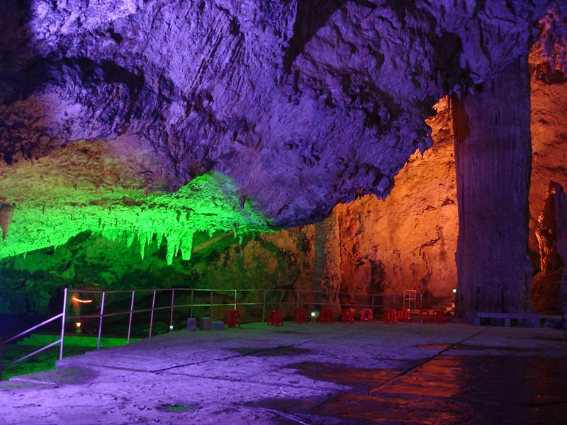 九天洞圖片 九天洞四絕: 第一絕:九天洞大 九天洞總面積250多萬平方米,折合4萬多畝。這樣一個大溶洞,比堪稱世界第一洞的利川溶洞還大3倍。據(jù)《環(huán)球天然奇觀》一書介紹,南斯拉夫的波斯托伊納大巖洞與美國的巴哈馬大藍洞,都稱為“世界上最大的洞”,還有古巴的貝拉雅馬爾大巖洞與我國貴州、湖北神農(nóng)架一些溶洞,也都被稱為“世界或中國最大的溶洞”?墒沁@些溶洞,同九天洞比較,都會感到遜色不少。1988年,中國科學(xué)地質(zhì)研究所巖溶與地下水研究室主任張壽越教授兩次來九天洞考察,他認為該洞是亞洲第一大洞,于是他給九天洞題詞:“滴石鑄玄女,暗河鏤九天”。1988年9月下旬,來自美國、英國與比利時的15位洞穴專家對九天洞作深入研究,連續(xù)7天7夜住在洞內(nèi)全面考察。通過考察,他們一致認為九天洞是世界奇跡,不僅具有很高的旅游價值,同時還有很高的科研價值。