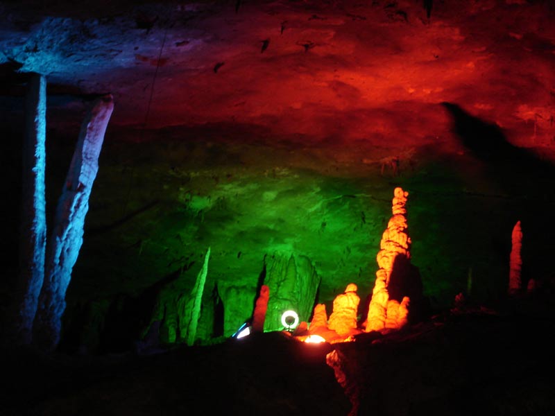 | 九天洞位于湖南張家界市桑植縣城17公里的利福塔鄉(xiāng),距市區(qū)70公里,距武陵源62公里,因洞內(nèi)有九個自然天窗九天洞而得名,總面積250公頃,是中國目前發(fā)現(xiàn)的溶洞之最,比號稱世界第一的利川溶洞大三倍。九天洞內(nèi)空氣清新,冬暖夏凉。整座洞穴分上、中、下三層,有五層不同高度的螺旋式觀景臺,最下層低于地表面400多米。經(jīng)初步探明洞內(nèi)有40個大廳、3條落差懸殊的陰河、12條瀑布、5座自生橋、10余座洞中山,此外,還有不可勝數(shù)的五光十色的鐘乳石群。在眾多迷人的景觀中尤以九星山、玉宮、水晶宮、九天玄女宮、壽星宮五大奇觀最為著名。