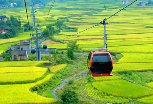 天門山索道途經(jīng)的美麗田園 天門山索道最大的亮點(diǎn)就是它的爬坡面支架的設(shè)計(jì) ,這個(gè)支架共有壓索輪96個(gè),托索輪16個(gè),它綜合了現(xiàn)代物理學(xué)、現(xiàn)代工程學(xué)、現(xiàn)代制造業(yè)中最先進(jìn)的理論和成果,應(yīng)用了世界最先進(jìn)的索道技術(shù),從而使這段索道總給人一種蕩氣回腸、氣勢(shì)沖天的感覺(jué)。