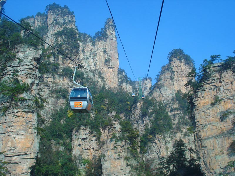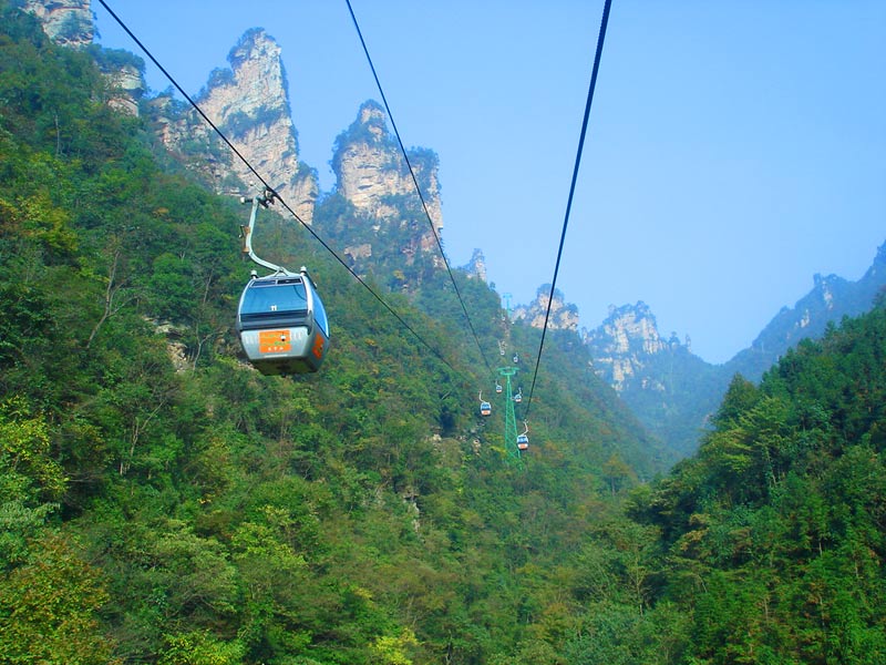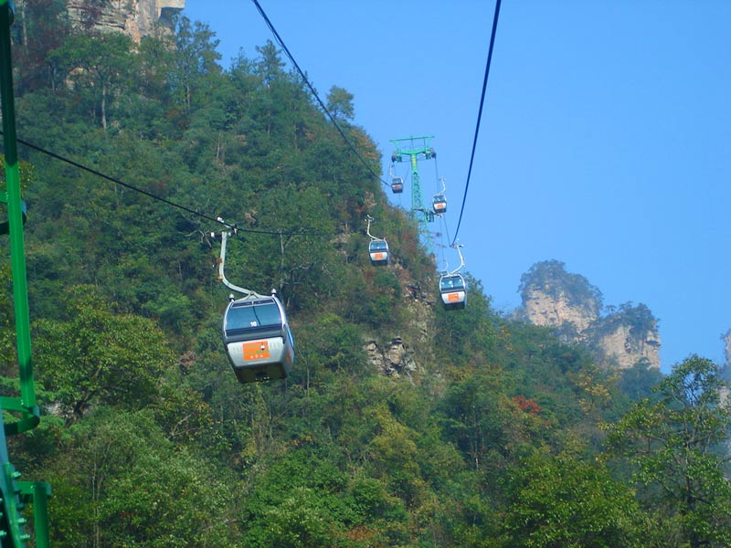天子山索道 天子山索道的建成開通,極大地改善了武陵源風景區(qū)的旅游交通環(huán)境,使游人花半日功夫上得天子山來只看一眼的遺憾,變成了間歇飛渡上山便可盡覽天子山這“擴大的盆景,縮小的仙境”的迷人景色之享受。乘坐天子山索道,既舒適又安全,沿線風光奇絕,奇松怪石,莽莽翠林,幽幽泉水,嬉戲獼猴,盡收眼底,令人嘆為觀止。尤其在云霧繚繞之時,游客乘坐索道更能體驗到神仙飄逸飛行的動感與刺激。