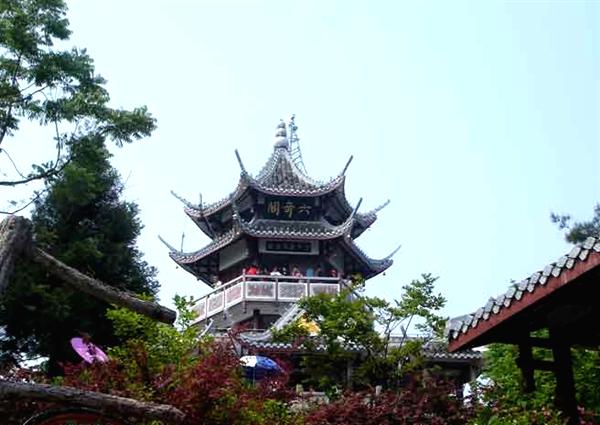 | 六奇閣位于張家界森林公園黃石寨項的人工建筑。因張家界國家森林公園”山奇、水奇、云奇、石奇.樹奇以及珍禽異獸之奇”而得名。閣分3層,黃瓦蓋頂,飛檐翹角,畫梁彩棟,回廊石欄。登閣憑眺,滿目佳景。閣柱楹聯日:“翠鬟煙籠,綠樹云封.昔日曾遮半個面:麗質天生,畫圖省識,今朝始醉四方人!庇忠宦撛啤懊麆尤颍酱藢嵖叭龘粽疲簞莅挝逶,歸來不用再看山!遍w內設有土家風情歌舞樓.竟日絲竹弦管,清音繞梁。閣基嵌有《張家界國家森林公園記》全文碑刻。1995年9月8日.全國政協主席李瑞環(huán)登閣賞景。