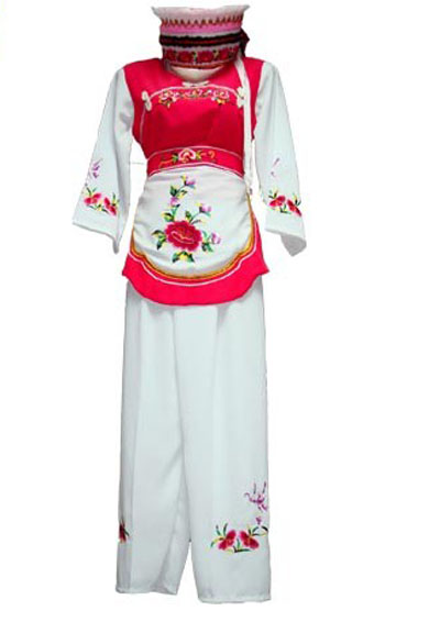 “崇尚白色”是白族人的一個(gè)明顯特點(diǎn)。不論男女都愛(ài)穿白色服飾,故有“要得俏,一身孝”之說(shuō),過(guò)去穿戴的白布又稱“家布機(jī)”,是白族人自己種棉花,自己紡紗,自己用土機(jī)織,用土法洗漂而成,其服飾美觀大方。一般來(lái)說(shuō),男子戴五尺、七或九尺的白布頭巾。上穿白色對(duì)襟布扣汗衣,外套青色滿肩馬褂,腰系桃花兜,并配撤穗荷包,下著青色寬腳褲,腳穿白布襪子和天官云頭鞋。婦女頭上蒙白色繡花帕,兩耳垂環(huán),手戴鐲子或戒指,外套繡花圍裙,用繡花飄帶系著,右上胸佩掛三吊或五吊銀質(zhì)牙簽。下著蘭色寬褲,腳纏白色裹腳布,穿繡花尖尖鞋。無(wú)婚女性則挽“簪巴”,挽于腦后的稱“粑粑”,挽于頭頂?shù)姆Q高把簪,簪上套有網(wǎng),橫插簪子;兒童衣服多繡花,外圍肚兜,頭戴虎頭鼓針菩薩帽,頸戴“項(xiàng)圈”、“百家鎖”等,手腕套有銀圈,上系小吊,吊上有錘、鈴、鞋、斧、簽等。