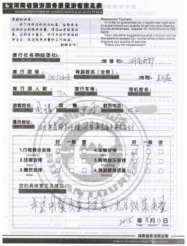 8月初,湖南邵陽周先生一行17位貴賓與湖南西部(張家界)中國國際旅行社工作人員——小王取得聯(lián)系,經(jīng)過商談,雙方達成協(xié)議并簽訂旅游合同,于8月9日抵達張家界,開始張家界之旅。此次行程是由我社優(yōu)秀導(dǎo)游——吳飛燕負責旅游接待工作,吳導(dǎo)在旅游過程中講解詳細,客人也很滿意,在意見表上要求我們:希望用餐質(zhì)量提商,尤為飯菜質(zhì)量,我們感謝周先生為我社提出了寶貴意見,謝謝周先生。同時也感謝周先生選擇湖南西部(張家界)中國國際旅行社,以及您對湖南西部國旅的信任與支持。我們會繼續(xù)努力,做好旅游接待工作。期待下一次與您的合作,祝您愉快!