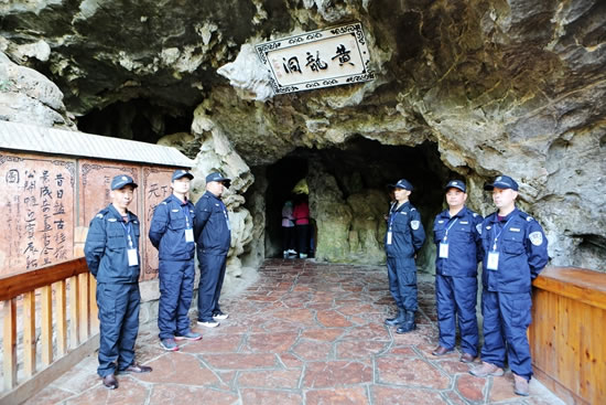 保護(hù)重于利用,開(kāi)放服從保護(hù)。4月16日一大早,筆者在黃龍洞景區(qū)看到,一支英姿颯爽的保安隊(duì)伍邁向洞內(nèi)各自指定的崗位。