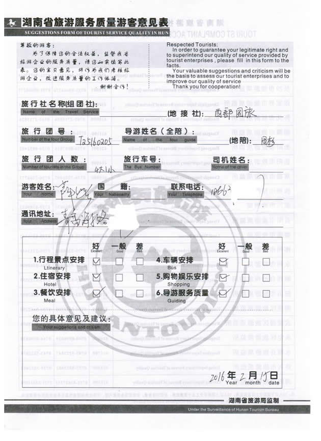 現(xiàn)在位置:首頁 -> 西部國旅->旅游質(zhì)量反饋 -> 2016-2-11 青島薛璐一行5位貴賓張家界、袁家界、黃龍洞、鳳凰古城四晚四日游