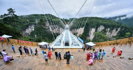 張家界大峽谷玻璃橋位于湖南省的張家界大峽谷景區(qū)栗樹埡和吳王坡區(qū)域內(nèi),為一座景觀橋梁,兼具景區(qū)行人通行、游覽、蹦極、溜索、T臺(tái)等功能。主跨430米,一跨過峽谷,橋面長(zhǎng)375米,寬6米,橋面距谷底相對(duì)高度約300米。這座全透明玻璃橋長(zhǎng)度、高度位居世界第一玻璃橋建成后,將成為世界首座斜拉式高山峽谷玻璃橋;并創(chuàng)下世界最高最長(zhǎng)玻璃橋、首次使用新型復(fù)合材料建造橋梁等多項(xiàng)世界之最。