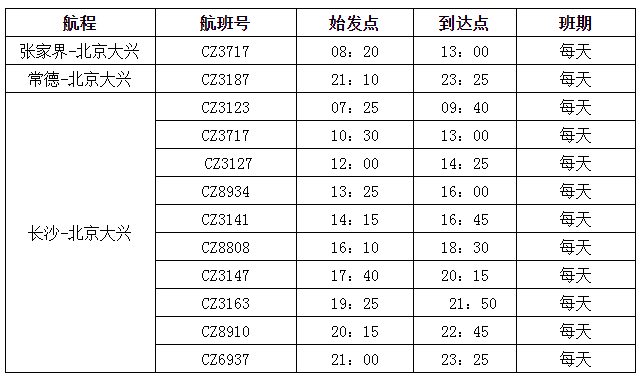 南航冬春換季后還全面優(yōu)化了各地往返北京大興的航線網(wǎng)絡。其中,張家界至北京大興航班為每天一班的朝發(fā)夕歸航班,去程CZ3717(張家界-大興)航班08:20張家界出港,回程CZ3164(大興-張家界)航班17:50北京大興起飛,時刻非常方便出行,張家界始發(fā)至大興單程僅450元起(不含稅)。常德每天往返北京大興1班;長沙每天往返大興10班(2班為寬體機),均提供“精品航線”服務。此外,北京大興往返廣州、深圳、上海、長沙、貴陽、珠海、?凇⑷齺、哈爾濱、大連、杭州、重慶、西安、烏魯木齊等全國主要城市均為早中晚全天候航班布局,方便旅客航空出行和中轉銜接。