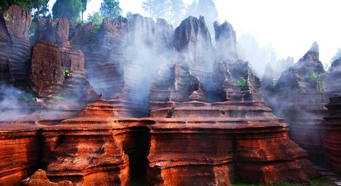 三、天下唯一的自然奇觀 走進古丈紅石林國家地質公園,就如同走進了一個夢幻般的世界,成柱成片的紅色石林、石崖、石墻、石峰,分布在群山峻嶺之中。石林造型千姿百態(tài),有的象總統(tǒng)頭像,巨人屹立,有的如神龜探海,鷹擊長空;有的像紫荊花怒放,海洋冰床,有的像城堡峰塔,大廈高樓,有的如樓蘭古城、駝鈴聲聲,有的像乳燕待哺、蝸牛搬家、有的如七彩迷宮、利劍刺空;有的像航母巡游、石兵列陣;有的如少女出浴、觀音坐蓮;有的像石鞭候主、靈龜探海;有的如棕熊迎客、天狗吠日;有的如水獺望云、母雞搗窩……尤以“大地劇場”、“巨人園”、“古城故宮”為奇石絕景中的最佳。
